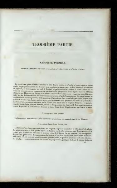 Just as, to succeed in drawing the head from nature or from a plaster cast, we studied the proportions before trying to sketch out its mass, then moved on to drawing the features, similarly, to succeed in drawing from nature or from a plaster cast, the entire body or academic study, we will start by studying the proportions of a figure viewed from different sides: man, woman, or child figures. Secondly, we will address the effects produced by different modes of movement of the figures, according to the organization of the human body and according to the general laws of gravity. Thirdly, we will mention the means of sketching the mass of an entire figure, after which we will proceed to the drawing from nature or from a plaster cast of hands and feet, to be treated in the second chapter, with this first chapter divided into three sections, namely: I. Proportions of figures; II. Movements and center of gravity; III. Method of drawing the mass of a figure from nature or from a plaster cast.
