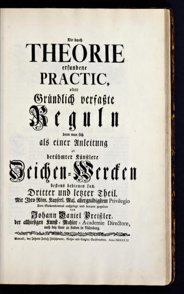 that can best be used as a guide to the drawing works of renowned artists. Third and final part. With the most gracious privilege of His Roman Imperial Majesty. Published for the seventh time and given out by Johann Daniel Preissler, the local Art-Painter: Academy Director, also available with him in Nuremberg. Printed by Johann Joseph Fleischmann, Counselor and Chancery Book Publishers. Year 1761.