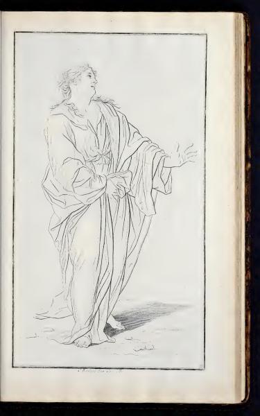 This image is a line drawing of a figure in flowing robes, attributed to the artist C. Bourbon. The robes are depicted with intricate detail, demonstrating classical artistic techniques. The figure appears to be gesturing or in motion, highlighting a study of movement and drapery.