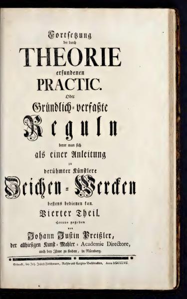The page is a title page for a section of a book outlining the effective use of drawing principles taught by theory. It presents itself as a guide for creating drawings in the style of renowned artists. The publication details indicate it was released in 1757 by Johann Justin Preissler in Nuremberg.