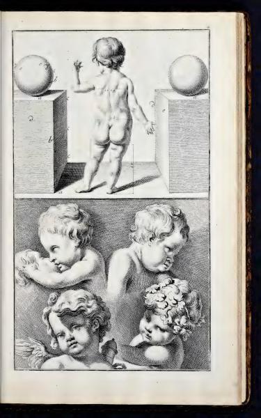 This page contains labeled illustrations used to teach drawing techniques, focusing on the human form and spatial relationships. The annotations provide guidance on interpreting the drawings in an 18th-century artistic context. The specific meanings of the letters are likely part of a broader instructional text not visible here.