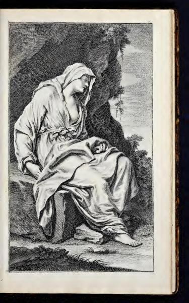The image shows an engraving of a seated figure, possibly a woman, dressed in draped clothing typical of classical or historical styles. The figure appears contemplative or resting, with a backdrop of rocky terrain and what seems to be a natural setting. This style of artwork may be utilized in the context of teaching drawing principles focused on the depiction of human form and clothing folds, which were common studies in art from the 18th century.