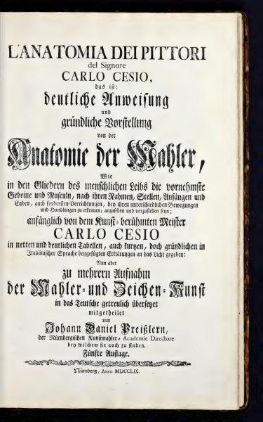 by the gentleman Carlo Cesio, which is: a clear instruction and thorough depiction of the anatomy of the electors, illustrating how the foremost bones and muscles in the human body, according to their names, positions, beginnings, and endings, should be recognized, viewed, and depicted from previous lists, during their different movements and actions; initially presented by the art-renowned master Carlo Cesio in neat and clear tables, with short yet thorough explanations in the Italian language; Now, however, for further benefit of painting and drawing art, faithfully translated into German and shared by Johann Daniel Preißlern, the Nuremberg painter and Academy director where they can also be found. Fifth edition. Lünberg, Year 1759.