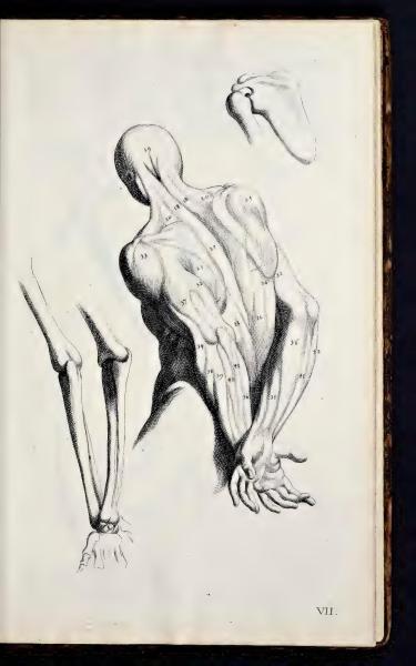 VII. Page Summary: The image contains anatomical drawings with numbered points, illustrating human muscles and joints, particularly focusing on the back and arm. This serves as a study reference for artists drawing human anatomy. << Go to previous page Go to Beginning of this Book Go to Index of this Book's pages Go to list of Books Go to next page >>