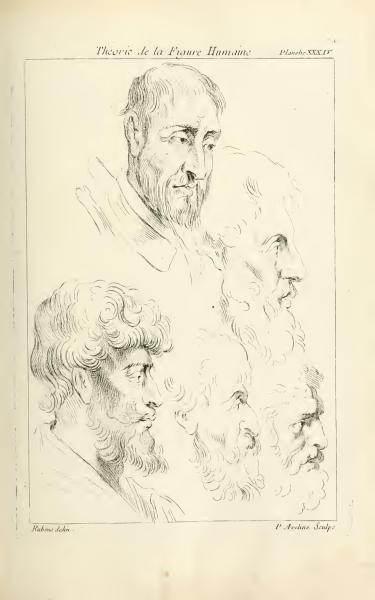 This page is from a work titled "Theory of the Human Figure," displaying a plate with engravings of male heads by Peter Paul Rubens and engraved by Pierre Aveline. The sketches showcase different profiles, highlighting variations in facial features. The text indicates Rubens created the original designs and Aveline executed the engravings.