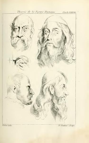 This page is from a work discussing the principles of the human figure in art. It is Plate 37, featuring drawings by Rubens and engravings by P. Aveline. The text identifies the creators responsible for the detailed sketches presented.