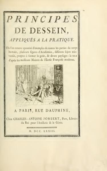The text is the title page of a work discussing the principles of drawing as applied to practice, emphasizing human anatomy and varied subjects. It includes contributions from prominent artists of the modern French School. The book was published in Paris by Charles-Antoine Jombert in 1773.