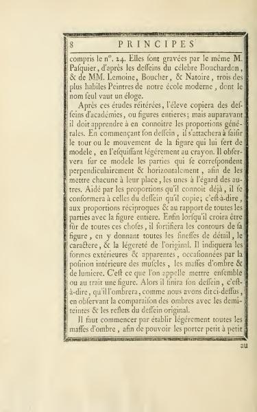 After these repeated studies, the student will copy drawings from academies or complete figures; however, before doing so, he must learn to understand general proportions. When starting his drawing, he will focus on capturing the outline or the movement of the figure that serves as his model, sketching it lightly with a pencil. He will observe on this model the parts that correspond vertically and horizontally, in order to place each one in its place, in relation to the others. Assisted by the proportions he already knows, he will align himself with those of the drawing he copies; that is, to the reciprocal proportions and the relation of all the parts with the entire figure. Finally, when he believes to be sure of all these things, he will strengthen the contours of his figure, adding all the refinements of detail, the character, and the lightness of the original. He will indicate the external and apparent forms, caused by the internal positioning of the muscles, the mass of shadows and light. This is what is called bringing a figure together or outlining it. Then he will finish his drawing, that is, he will shade it, as we have said above, by observing the comparison of shadows with the half-tones and reflections of the original drawing.