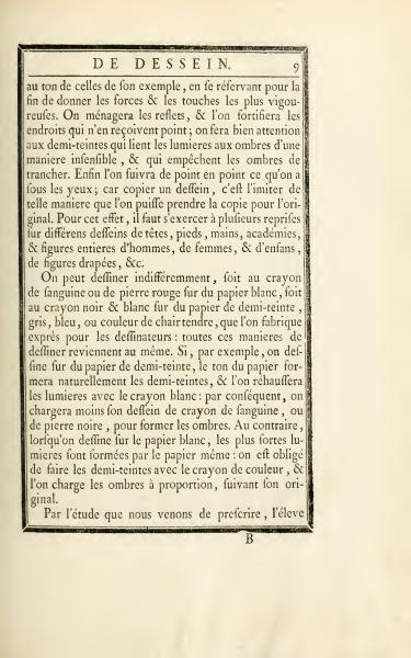 One may draw indifferently, either with a sanguine or red chalk pencil on white paper or with a black & white pencil on half-tone paper, gray, blue, or light flesh color, which is made specifically for draftsmen. All these drawing methods are basically the same. If, for example, one draws on half-tone paper, the tone of the paper will naturally form the half-tones, and the lights will be highlighted with a white pencil; thus, one will load the drawing less with a sanguine pencil or black stone for forming shadows. Conversely, when drawing on white paper, the strongest lights are formed by the paper itself; one is obliged to create the half-tones with a color pencil and accordingly load the shadows proportionally, following his original.