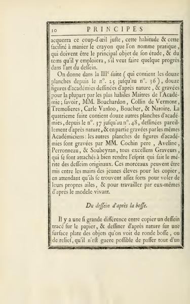 In the third series (which includes the twelve plates from No. 25 to No. 36), it offers twelve academy figures defined from nature, mostly engraved by the most skilled Masters of the Academy; namely, Messrs. Bouchardon, Collin de Vermont, Tremolières, Carle Vanloo, Boucher, and Natoire. The fourth series contains twelve other academy plates, from No. 37 to No. 48, defined similarly from nature, and partly engraved by the same Academicians. Other academy figure plates are engraved by Messrs. Cochin senior, Aveline, Perronneau, and Soubeyran, all excellent engravers, who put effort into capturing the spirit that makes the original designs meritorious. These pieces can be given to young students for them to copy, until they are strong enough to fly with their own wings and work independently from the living model.