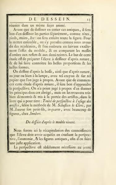 One draws from the bust as well as from life, in daylight or lamplight, with any pencil and on any paper deemed appropriate. Before starting this study from life, it is good to learn perspective. The principles are not provided in this summary, but they are well demonstrated and made accessible to artists in the book titled: Treatise on Perspective for the Use of Artists, according to the method of Mr. Sébastien le Clerc, by Mr. Jeaurat his grandson, in quarto, with many figures, at publisher Jombert.