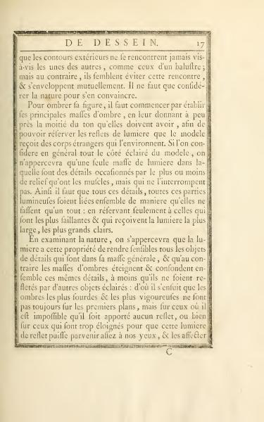 In examining nature, one will notice that light has the property of making all detail objects in its entire mass visible, whereas shadow masses extinguish and blend these same details unless they are reflected by other illuminated objects. This leads to the conclusion that the most muted and vigorous shadows are not always on the foremost planes but on those where it is impossible for any reflection to be shown, or on those too far for reflected light to reach our eyes easily and affect them.
