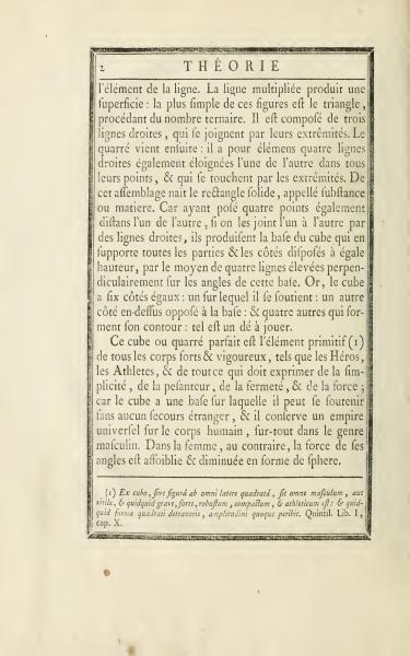 (1) From the cube, or figure squared on all sides, let everything masculine or virile, and everything heavy, strong, robust; compact, and athletic is. And whatever is taken away from the form of the square will likewise perish in amplitude. Quintil. Book I, chapter X.