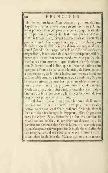 relating to the subject. But how can one depict the various movements of the soul according to nature? How can one capture, from a scene composed of several people, all the sensations that affect each separately, according to the personal interest they take in the spectacle in front of them, whether of hate, anger, despair, astonishment, or horror? If one were to attempt to capture just one of these expressions, the effort would become almost impossible, because they are all produced only by the circumstances of a moment, which the next instant decomposes and destroys: that is to say, a person may switch from hatred to pity, from astonishment to admiration, from joy to sorrow, or that even with the same sustained passion, it will either strengthen or weaken, and the same character may take on an infinite variety of facial expressions for an attentive observer. These difficulties are almost insurmountable for the artist who would attempt to capture such fleeting phenomena with the tip of their pencil.