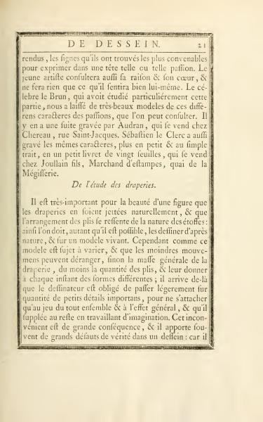 It is very important for the beauty of a figure that draperies are laid out naturally, and that the arrangement of the folds reflects the nature of the fabrics: thus one should, as much as possible, draw them from nature, and on a living model. However, since this model is subject to variation, and since the slightest movements can disturb, if not the general mass of the drapery, then at least the quantity of folds, and give them different forms at each moment; it follows that the draughtsman is obliged to lightly overlook a quantity of important small details, so as not to focus only on the play of the whole ensemble and the general effect, and that he compensates for the rest by working with imagination. This inconvenience is of great consequence, and it often results in great defects of truth in a drawing: because it