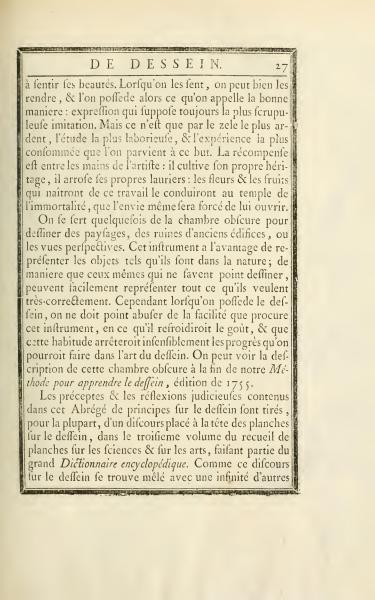 Sometimes the camera obscura is used to draw landscapes, ruins of ancient buildings, or perspective views. This instrument has the advantage of representing objects as they are in nature; so that even those who cannot draw can easily represent everything they want very accurately. However, when one possesses the skill of drawing, one should not abuse the ease that this instrument provides, as it would cool the taste, and this habit would subtly hinder the progress that could be made in the art of drawing. You can find the description of this camera obscura at the end of our Method for learning drawing, edition of 1755.