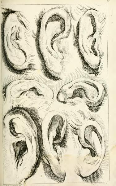 A10 Page Summary: The image contains minimal text, with only the identifiers "A" and "10." The primary focus is on the engraved illustrations of human ears, designed to study their anatomical features. << Go to previous page Go to Beginning of this Book Go to Index of this Book's pages Go to list of Books Go to next page >>