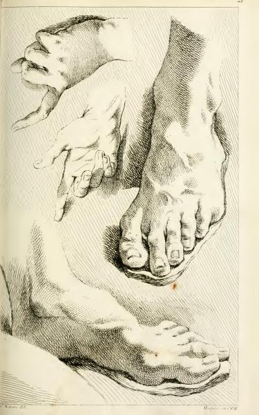 The image contains detailed artistic sketches of human hands and feet designed for studying human anatomy. These illustrations focus on the shapes and structures important for artists learning to draw human figures accurately. No translatable text was present, only detailed anatomical drawings.