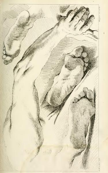 The image features anatomical illustrations of human hands and feet, detailed with precision. They demonstrate the musculature and anatomical structure using cross-hatching techniques for shading and depth typical of 18th-century engravings.