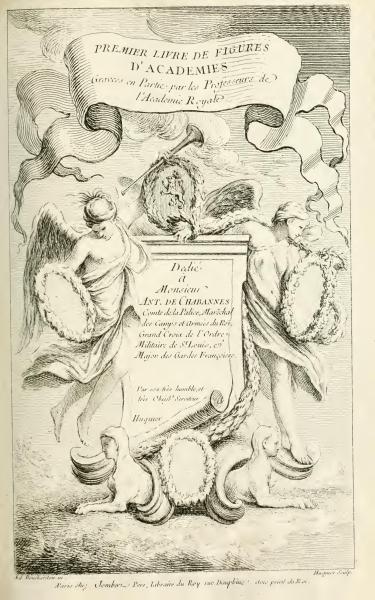 This title page introduces the "First Book of Academy Figures," partially engraved by professors of the Royal Academy. It is dedicated to a high-ranking official, the Count of La Palice, and is presented by Huquier, the servant. The publication details indicate it was distributed by a bookseller of the King in Paris.