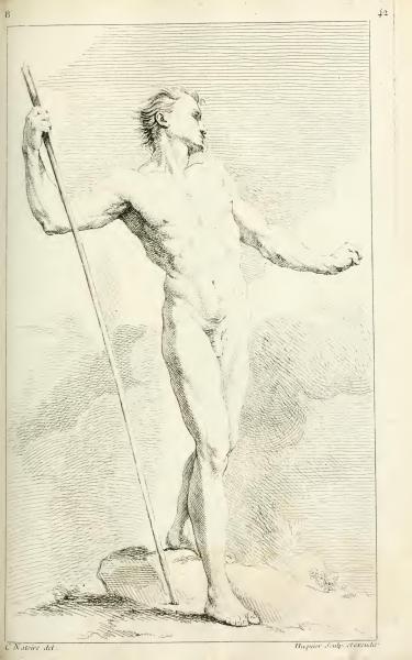 The image credits the drawing to C. Natoire and the engraving to Huguier, with the number '42' marked. It showcases a male figure, demonstrating principles of human figure drawing. The emphasis is on anatomical accuracy and dynamic pose, in keeping with the book's focus on figure study.