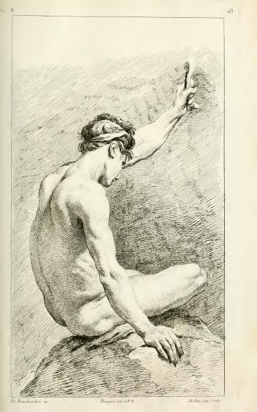 The text credits the design and sculpture to Bouchardon, Huquier, and Aveline. They were involved in the artistic process of this engraved plate. The work reflects a collaborative effort in capturing the human figure.