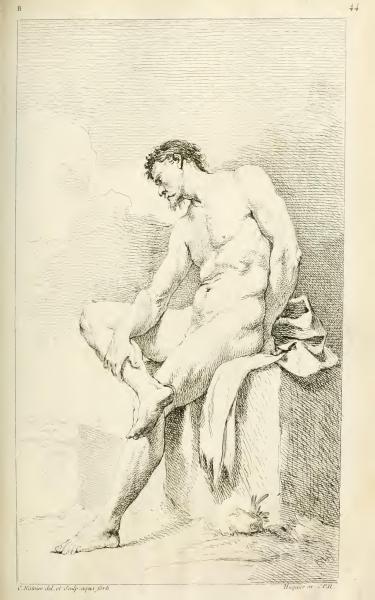 The text describes the creators of the artwork: C. Natoire designed and sculpted it while Buqouer executed it. The artwork appears to depict an almost nude male figure and is part of anatomical or artistic studies by Rubens.