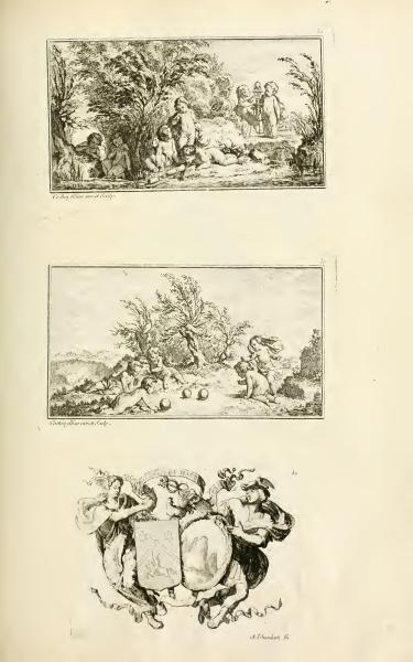 The text consists mainly of captions for the images, identifying one of the engravers as C. Silvestre, who invented and engraved the scenes. Another artist, A. Schoharide, is credited with making one of the pieces. These captions suggest a collaborative effort in the creation of the artworks.