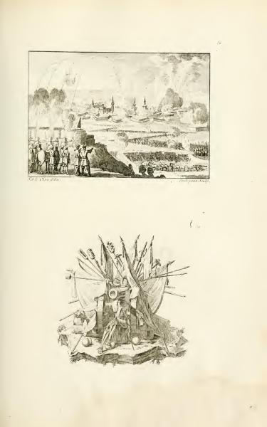 Nob. de Clerck drew this Page Summary: The text notes that the drawing was created by someone named Nob. de Clerck. The page includes two engravings depicting scenes of military activity and equipment. << Go to previous page Go to Beginning of this Book Go to Index of this Book's pages Go to list of Books Go to next page >>