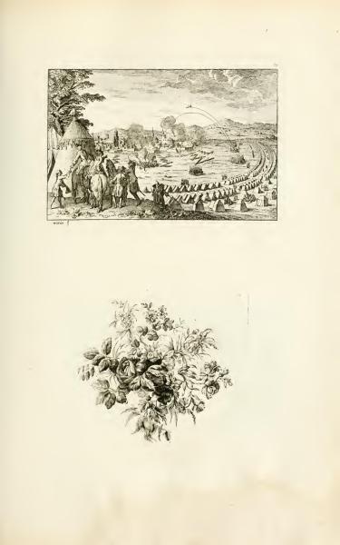The page features two engravings: a military landscape and a decorative floral illustration. These images are likely part of a work by Peter Paul Rubens, showcasing his interest in both narrative scenes and detailed ornamental designs. The engravings highlight the artistic and engraving techniques of the 18th century.