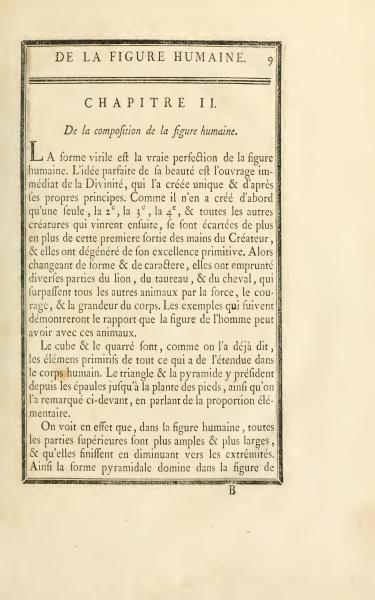 The male form is the true perfection of the human figure. The perfect idea of its beauty is the immediate work of the Divine, which created it unique and according to its own principles. As only one was initially created, the second, third, fourth, and all other creatures that followed gradually strayed further from this original creation by the Creator and degenerated from its primitive excellence. Changing in form and character, they borrowed various parts from the lion, the bull, and the horse, which surpass all other animals in strength, courage, and size of body. The following examples will demonstrate the relation the human figure might have with these animals.