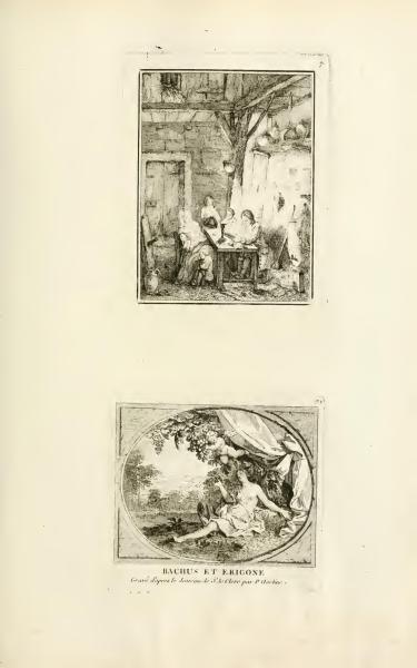 The text under the second image states that it is titled "Bacchus and Erigone" and was engraved by P. Aveline from a design by S. Le Clerc. The image appears to depict a classical mythological scene.