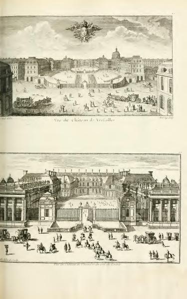 The text describes two views of the Palace of Versailles. The first is a general view, while the second focuses on the courtyard side. Both highlight the architectural grandeur of the palace.