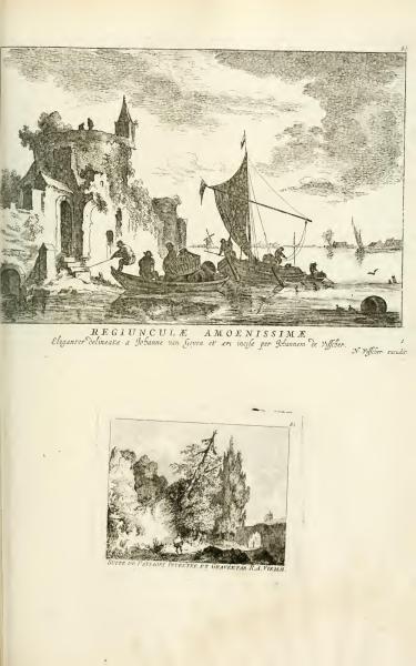 The image features two artworks. The first is a landscape by Johan van Goyen, elegantly crafted and engraved by Johann de Visscher, showcasing charming natural scenery. The second is a sequence of landscapes invented and engraved by J. Aveline.