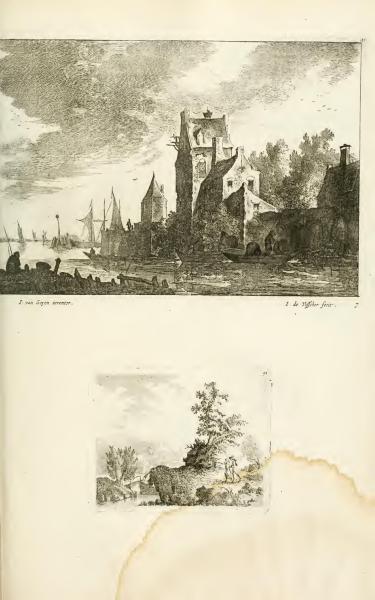 The text credits J. van Goyen with creating the original design and I. de Vischer with executing the engraving. This information accompanies the illustrations on the page. The page is part of a historic book on artistic theory by Peter Paul Rubens, translating concepts for understanding and creating human figures.