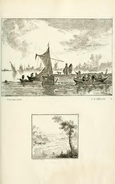 The text identifies Jan van Goyen as the inventor of the compositions and F. de Vissher as the engraver. The engravings illustrate typical life scenes along a river and a pastoral landscape. The terms "inventor" and "fecit" indicate the original designer and the engraver of the images respectively.