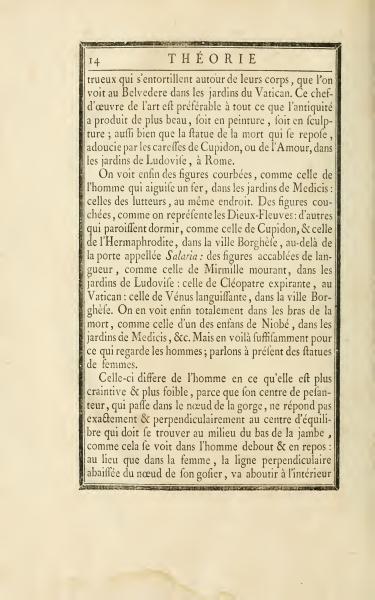 The female figure differs from the male in that it is more timid and weaker, because her center of gravity, which passes through the knot of the throat, does not exactly and perpendicularly align with her center of balance which should be found midway down the leg, as is seen in a man standing and at rest: whereas, in a woman, the perpendicular line descending from the knot of her throat, ends up inside. This tangle of knots around their bodies can be seen in the Belvedere in the Vatican gardens. This masterpiece of art is preferable to all that antiquity has produced more beautifully, whether in painting or sculpture; as well as the statue of death resting, softened by the caresses of Cupid, or Love, in the gardens of Ludovia in Rome.