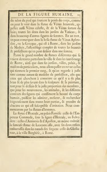 From the heel of the foot that supports the body's weight, as seen in the statue of Happy Venus, also called Venus Celestial, and Venus leaving the bath; both found in the Vatican Gardens; and in many other statues of women. In short, one can notice in the beautiful statue of Venus Aphrodite, or the Greek one, which is in Rome, in the gardens of the Medicis, a complete assembly of all the beauties and perfections one might desire in a woman. Among the many different statues seen throughout the city and the suburbs of Rome, as well as in its gardens, cities, palaces, and private homes, we will review those that hold the highest rank and are rightly regarded as models of perfection. This is so that those who seek to know what is most beautiful and knowledgeable in sculpture and painting, both in design and in the proper proportion of limbs, as well as in movements, postures, and the different contours that constitute the beauty of the human body, may admire them, measure them, and carefully search every part, and take from each what is susceptible to imitation. We will start with statues of men. The statue of Hercules, at the Farnese Palace; that of Emperor Commodus as Hercules, at the Belvedere; those of Antinous and Apollo, in the same place: the famous statue of Laocoon seated, with his two children entangled in the serpent's knots; that of the Gladiator, at the Borghese city in Rome.