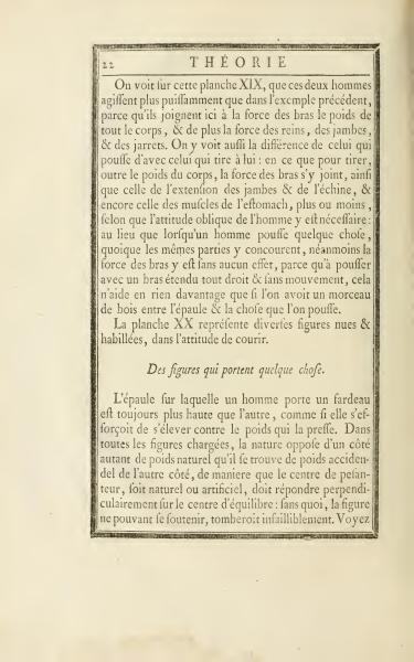 This plate XIX shows two men acting more powerfully than in the previous example, because here they combine the strength of their arms with the weight of their entire body, as well as the strength of the loins, legs, and calves. It also shows the difference between someone who pushes and someone who pulls: for pulling, in addition to the weight of the body, the strength of the arms is involved, along with the extension of the legs and spine, and also the muscles of the abdomen, more or less depending on how necessary the oblique posture of the individual is. In contrast, when someone pushes something, even though the same body parts are involved, the strength of the arms has no effect because pushing with an outstretched arm without movement is no more helpful than placing a piece of wood between the shoulder and the object being pushed.