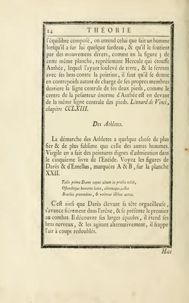 The text discusses the concept of composite balance, using Hercules and Antaeus as an example of counterbalance in carrying a load. It then explores the proud and sublime nature of athletes' movements, referencing depictions by Virgil. The imagery of Dares in a battle stance illustrates the physicality and grandeur of such figures.