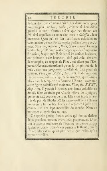 Inside, it is said that this name is derived from the two Greek words "μέγας" (megas), meaning 'great', and "ὤεος" (oculus), meaning 'eye', as if saying large to the eye. Others say that these statues were named after a certain Colossus, their inventor. Regardless, these colossal statues are only fitting for the most powerful gods, like Jupiter, Minerva, Apollo, Mars, and other similar deities. It was inappropriate, therefore, for Roman Emperors and some barbarian kings to claim this honor, as well as that of triumphal arches, according to the report by Pliny, who claims that Emperor Nero ordered a colossal painting of him on canvas, measuring 120 feet in height. Pliny, Book XXV, Chapter VII. He also mentioned that Phidias made two figures in a mantle that Catulus placed in the temple of Fortune in Rome, along with another colossal figure that was nude. Pliny, Book XXXIV, Chapter VIII. In Rhodes, there was a colossal bronze statue of the Sun, made by Chares, a student of Lysippos, which was 70 cubits tall. It was situated at the entrance of the port of Rhodes, and ships would sail with full sails between its legs. It was rightly considered one of the Seven Wonders of the world. We will discuss this further later.