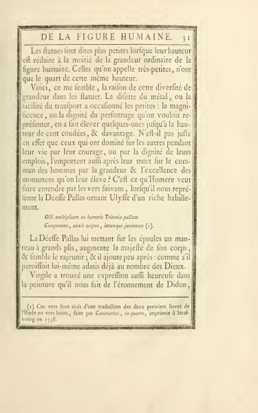 The text discusses the varying sizes of statues, attributing smaller sizes to practicality and larger ones to the magnificence or dignity of the person represented. It cites Homer and Virgil, illustrating how grandeur was conveyed in ancient art and literature. The passage also references an example involving the Goddess Pallas and Ulysses, indicating the symbolic use of statues and monuments to honor notable figures.
