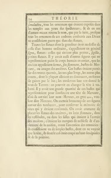 All statues larger than those of an ordinary man were generally called signa, statues; those that were smaller were referred to as sigilla, small statues. There were also other figures that did not represent the full human body, which the ancients called hermae, or flemmata, busts of Mercury or images of ancestors. These busts stood on square trunks, some longer, others shorter, often tapering into a pedestal. Modern times have given them the name Termes, where one could change the head at will. Many of these busts generally depicted a head of Mercury, hence their name: Hermes, in Greek εμρης, meaning Mercury. Many such figures were placed around tombs to preserve the memory of the interred. It was customary to place statues of ancestors, in Latin flemmata, in vestibules, or in the halls at the entrance of houses; they were symbols of nobility and antiquity before the invention of coats of arms, consisting of simple busts showing only the head, with the neck cut off at the top of the shoulders and chest.