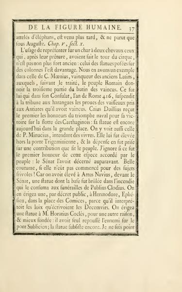 The use of representing on a chariot with two horses those who, after their praetorship, had circled the circus, is also not very old: the custom of placing statues on columns is older. We have an example of this in the case of C. Moenius, conqueror of the ancient Latins, to whom, according to the treaty, the Roman people assigned a third of the spoils of the defeated. He was the one who, in his Consulship, in the year 416 of Rome, hung the prows of the ships taken from the Antiates he had defeated on the tribune for speeches. Caius Duillius was the first to receive the honors of a naval triumph for his victory over the Carthaginian fleet; his statue still stands today in the main square. There is also one of P. Minucius, the food superintendent. It was raised to him beyond the Trigemiliana gate, and the expense was taken from a contribution made by the people. I do not know if this was the first honor of this kind granted by the people; the Senate had awarded it beforehand. A beautiful custom, if it had not begun for trivial subjects! For they had erected for Attus Navius, in front of the Senate, a statue whose base was burned in the fire that consumed it at the funeral of Publius Clodius. A statue was erected, by public decree, for Hermodorus of Ephesus in the Comices square because he interpreted the laws written by the Decemvirs. A statue was also erected for M. Horatius Cocles, for another reason, and better founded: he had alone repelled the enemy on the Sublician bridge; the statue still stands. I do not...