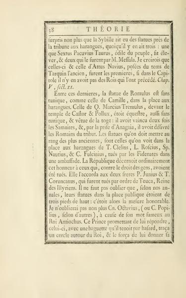 Among these, the statue of Romulus is without a tunic, like that of Camillus, in the place for speeches. The statue of Q. Marcius Tremulus, in front of the temple of Castor and Pollux, was equestrian, also without a tunic, and clothed in the toga: he had defeated the Samnites twice and, by a plea from Anagnia, freed the Romans from tribute. The statues that should be considered among the oldest are those seen in the place for speeches of T. Clelius, L. Roscius, Sp. Nautius, and C. Fulcinius, who were killed by the Fidenae on an embassy. The Republic usually honors those who, against the law of nations, were killed. This honor was given to the two brothers P. Junius and T. Coruncanus, who were killed by order of Teuca, Queen of the Illyrians. It should not be forgotten that, according to our annals, their statues in the public square were three feet high: this was then an honorable measure. I will not forget either Cn. Octavius, (or C. Popilius, according to others), because of his famous words to King Antiochus. This Prince, promising to give him an answer, with a staff he happened to be holding, drew a circle around the King and forced him to give