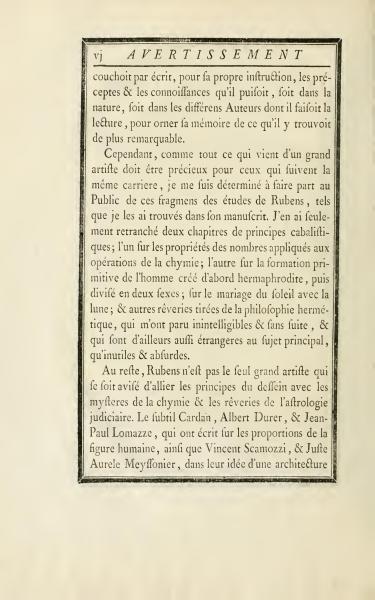 However, as all that comes from a great artist must be precious for those who follow the same career, I decided to share with the public these fragments of Rubens' studies, as I found them in his manuscript. I have only removed two chapters on cabalistic principles; one on the properties of numbers applied to chemical operations, the other on the primitive formation of man, first created as hermaphrodite, then divided into two sexes; on the marriage of the sun and the moon; and other reveries drawn from hermetic philosophy, which seemed to me unintelligible and incoherent, and which are also foreign to the main subject, as well as useless and absurd.