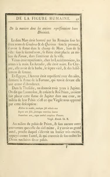 The text discusses how various ancient cultures represented their deities. Mars had statues in different locations in Rome, Venus was depicted with varying attributes across regions, and Cupid in Egypt was shown with wings. Additionally, in Thessaly, Jupiter was illustrated with three eyes, and the text references Virgil's description of an altar in Priam's palace.