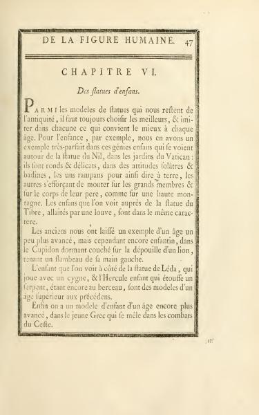Among the models of statues that remain from antiquity, it is always necessary to choose the best and imitate in each what suits each age the best. For childhood, for example, we have a very perfect example in those child-like figures seen around the statue of the Nile in the Vatican gardens. They are round and delicate, in playful and frolicsome attitudes; some are crawling, so to speak, on the ground, while others are trying to climb onto the large limbs and the body of their father as if on a high mountain. The children seen near the statue of the Tiber, nursed by a wolf, are of the same character.