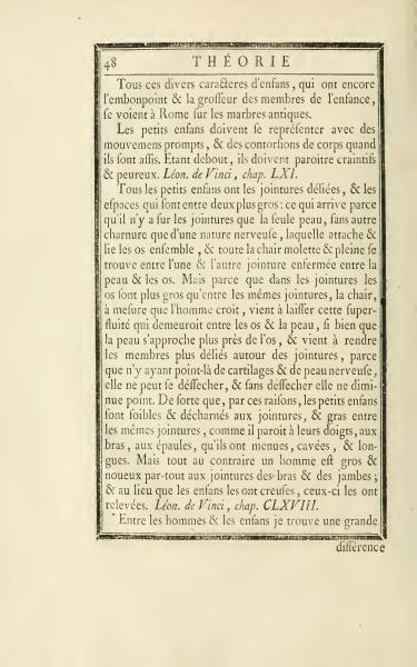All young children have loose joints and the spaces between them are larger: this occurs because, at the joints, there is only skin and no other flesh except for a nervous nature that binds and connects the bones together, so that the soft and fleshy part is found between each joint enclosed by the skin and the bones. But because in the joints the bones are larger than in the same joints, the flesh, as the person grows, leaves this excess that would remain between the bones and the skin, so that the skin approaches closer to the bone, and makes the limbs more slender around the joints, because where there is no cartilage and nervous skin, it cannot wither, and without withering, it does not diminish. Therefore, for these reasons, young children are weak and lean at the joints and plump between the same joints, as seen in their fingers, arms, shoulders, which are thin, hollow, and long. But on the contrary, a man's joints are thick and knotty everywhere; and whereas children have hollow ones, men have raised ones. Leonardo da Vinci, Chapter 168.