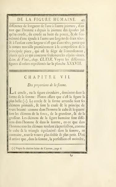 The circle, or circular figure, dominates in the form of a woman. Plato asserts that it is the most beautiful shape. The circle and rounded form are its primitive elements and are the cause and principle of all beauty. Whereas in man, the cube and square are the elements of strength, grandeur, and mass. The elements of the human figure differ in men and women, as in men all elements tend to perfection, like the cube and equilateral triangle. In women, on the contrary, everything is found weaker and smaller. Therefore, in women, perfection is less.